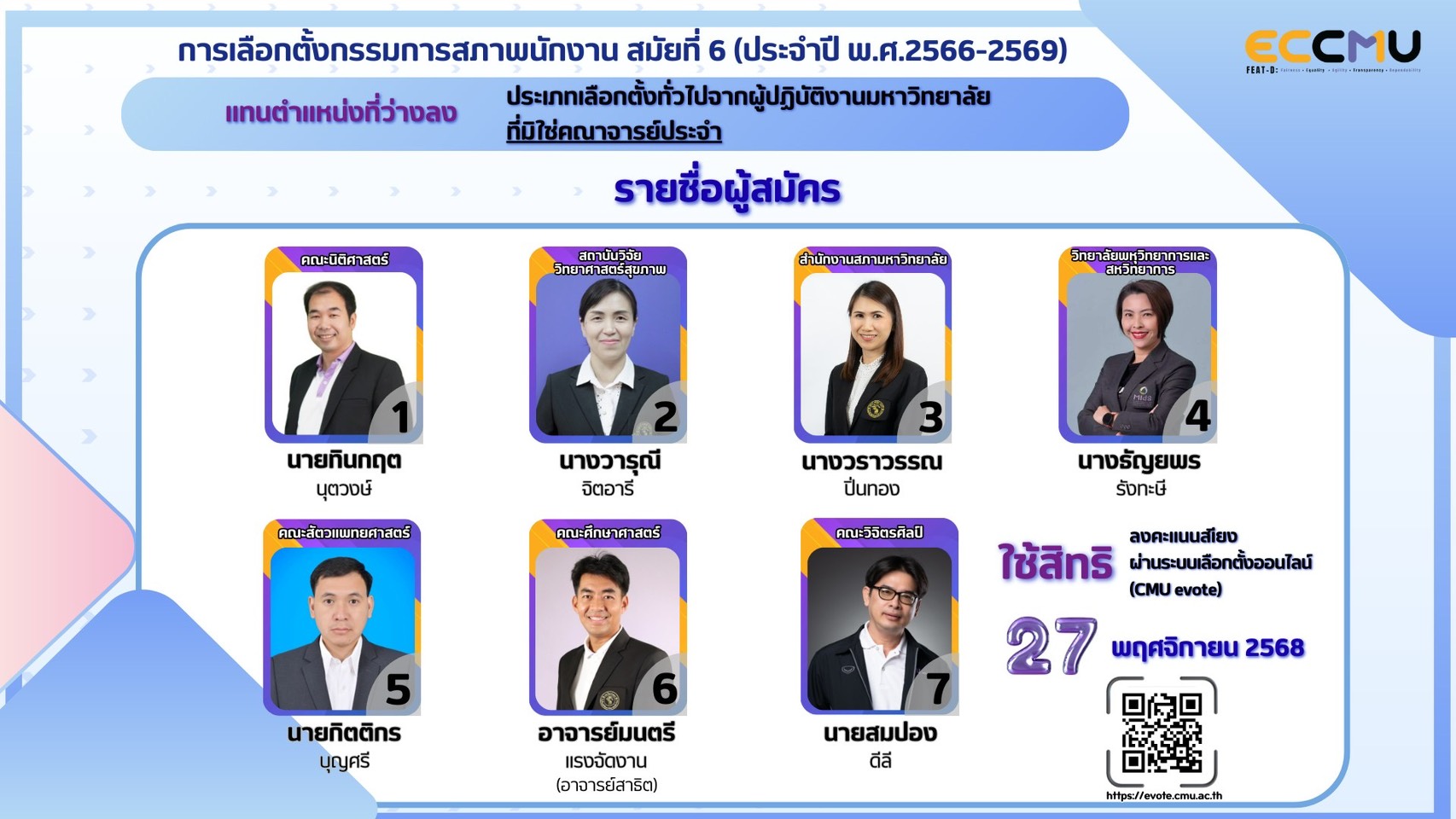 ใช้สิทธิลงคะแนนเลือกตั้งกรรมการสภาพนักงาน (แทนตำแหน่งที่ว่างลง) ประเภทเลือกตั้งทั่วไปจากผู้ปฏิบัติงานมหาวิทยาลัยที่มิใช่คณาจารย์ประจำ