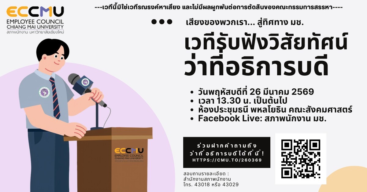 ในการนี้ สภาพนักงานจึงใคร่ขอเรียนเชิญท่านเข้าร่วมกิจกรรมดังกล่าวในวันพฤหัสบดีที่ 26 มีนาคม 2569 เวลา 13.30 -16.30 น. ณ ห้องประชุมธนี พหลโยธิน คณะสังคมศาสตร์ หรือรับชมผ่านทาง Facebook Live : สภาพนักงาน มช. โดยสามารถฝากข้อคำถามได้ที่ https://cmu.to/260369