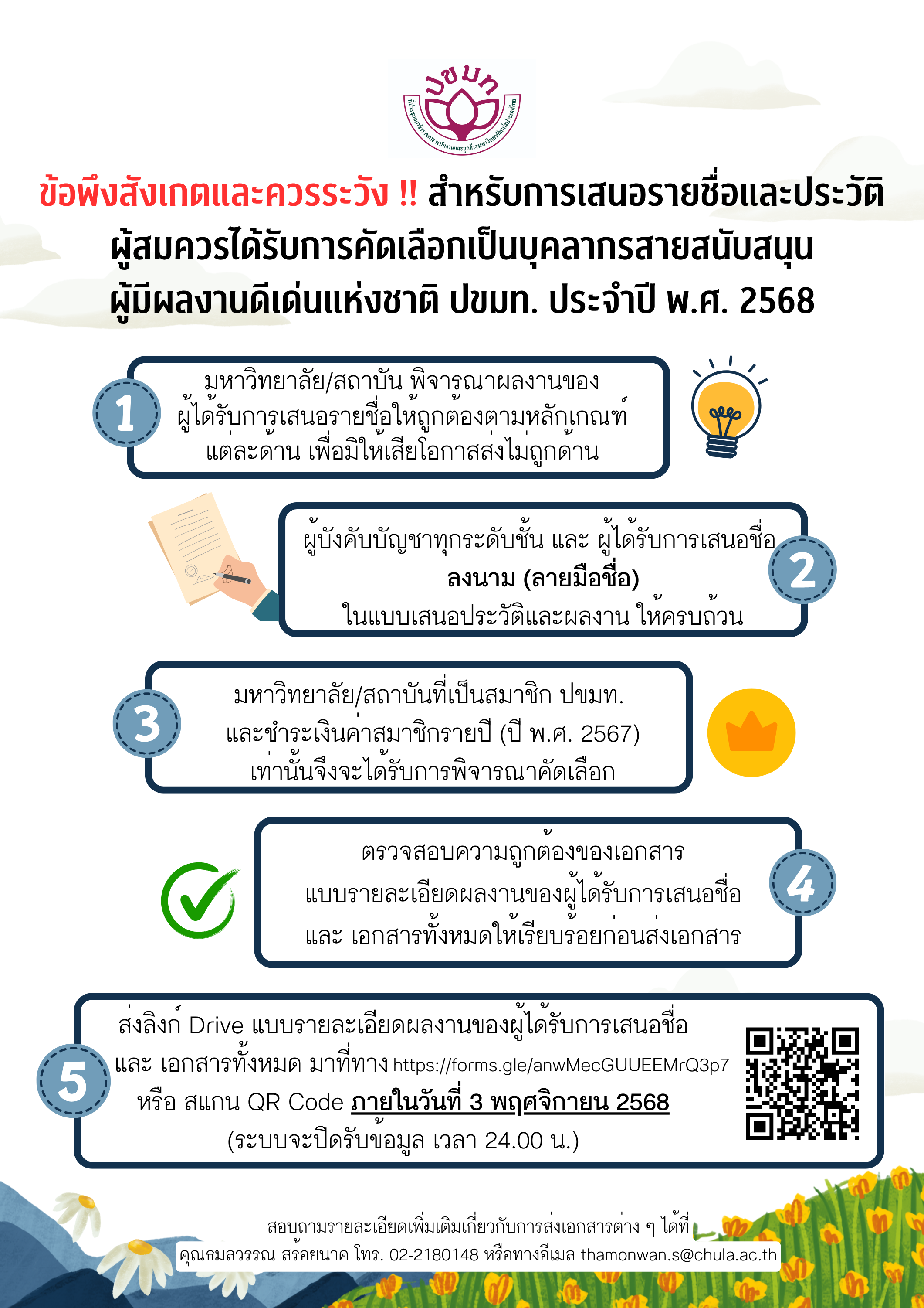 ด้วยที่ประชุมสภาข้าราชการ พนักงาน และลูกจ้างมหาวิทยาลัยแห่งประเทศไทย (ปขมท.) ได้เชิญชวนให้พิจารณาคัดเลือกบุคลากรสายสนับสนุนในสถาบันอุดมศึกษา เข้ารับการพิจารณาเสนอชื่อและประวัติผู้สมควรได้รับการยกย่องเป็นบุคลากรสายสนับสนุนผู้มีผลงานดีเด่นแห่งชาติ ปขมท. ประจำปี พ.ศ. 2568 จำนวน 5 ด้าน คือ ด้านบริการดีเด่น ด้านบริหารดีเด่น ด้านวิชาชีพดีเด่น ด้านสร้างสรรค์นวัตกรรมดีเด่น และด้านลูกจ้างผู้มีผลงานดีเด่น ตามรายละเอียดเอกสารดังแนบมาพร้อมนี้ ทั้งนี้ หากส่วนงานใดประสงค์จะเสนอชื่อบุคลากรสายสนับสนุนในสังกัดเพื่อเข้ารับการพิจารณาคัดเลือกฯ ขอให้จัดทำแบบเสนอประวัติและผลงาน(แบบ ปขมท 2) และส่งทางสารบรรณอิเล็กทรอนิกส์ CMU e-Document สำนักงานสภาพนักงาน ภายในวันศุกร์ที่ 3 ตุลาคม 2568 เวลา 16.30 น. เพื่อสภาพนักงานจะได้ดำเนินการพิจารณาคัดเลือกและเสนอชื่อเป็นตัวแทนของมหาวิทยาลัยเชียงใหม่ให้ ปขมท. เพื่อพิจารณาต่อไป